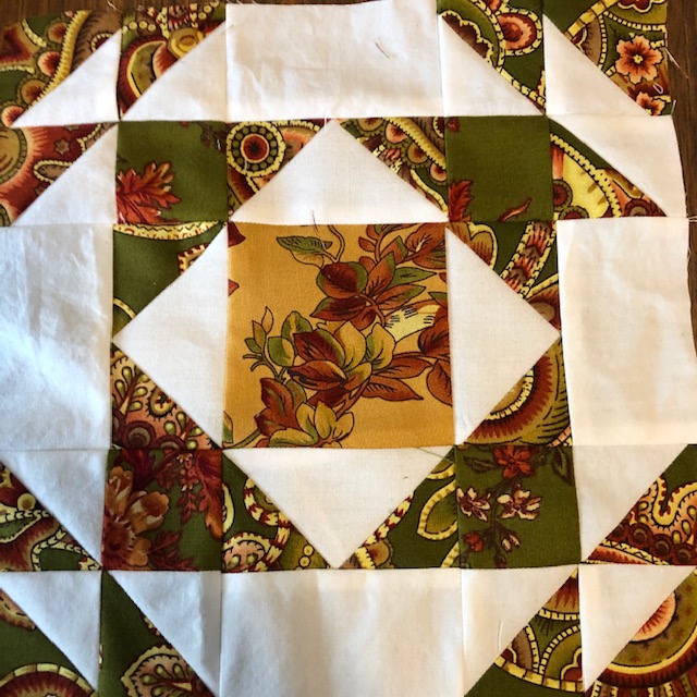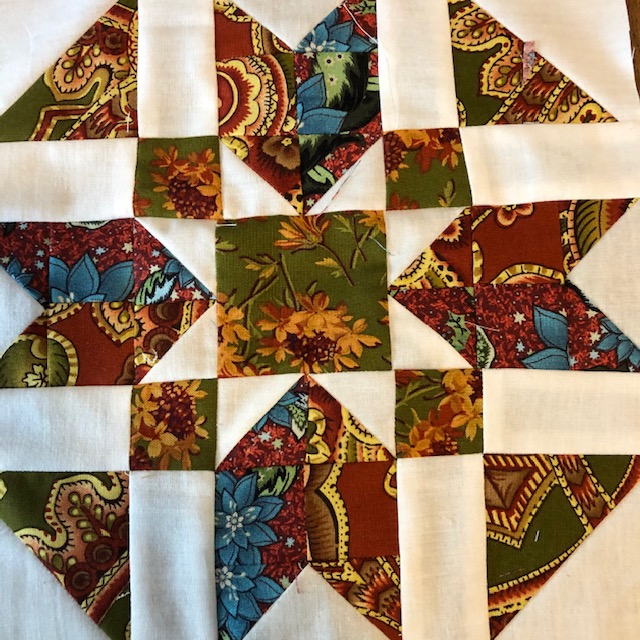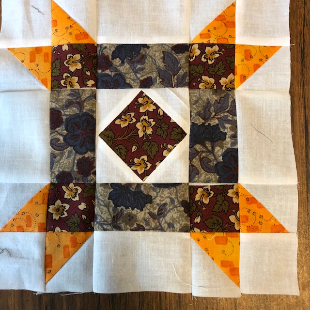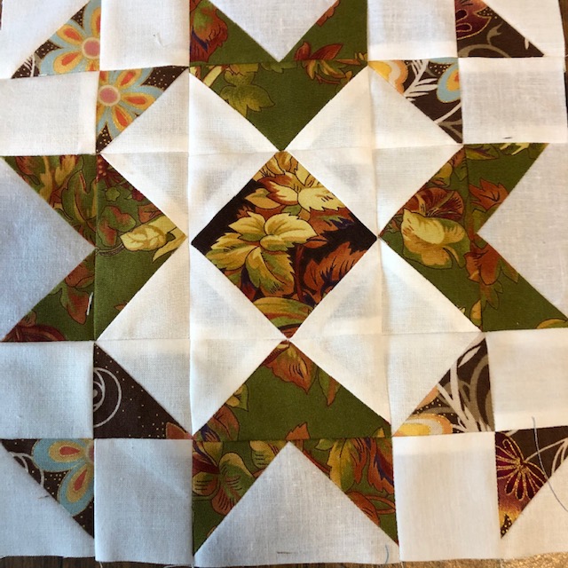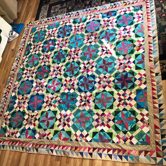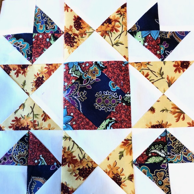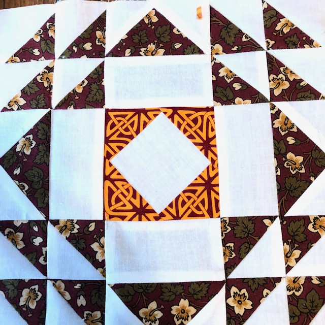 Day 9 My hand dyed fabrics were used in this quilt. It is heavily hand quilted. I changed the name of the pattern from October weekend to October Madness. It was hard to get all of the pieces in the right order. Some are not, but it’s hard to tell where they are.