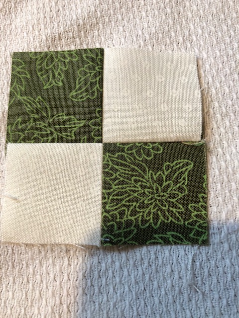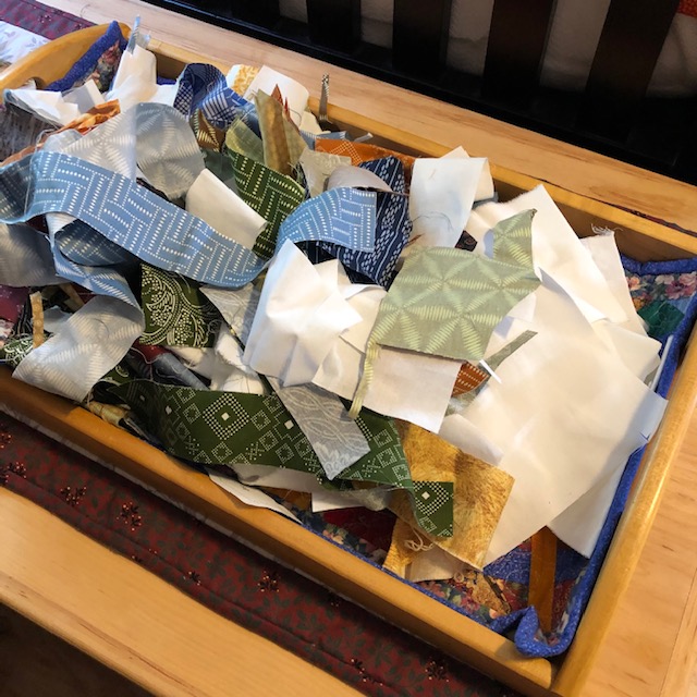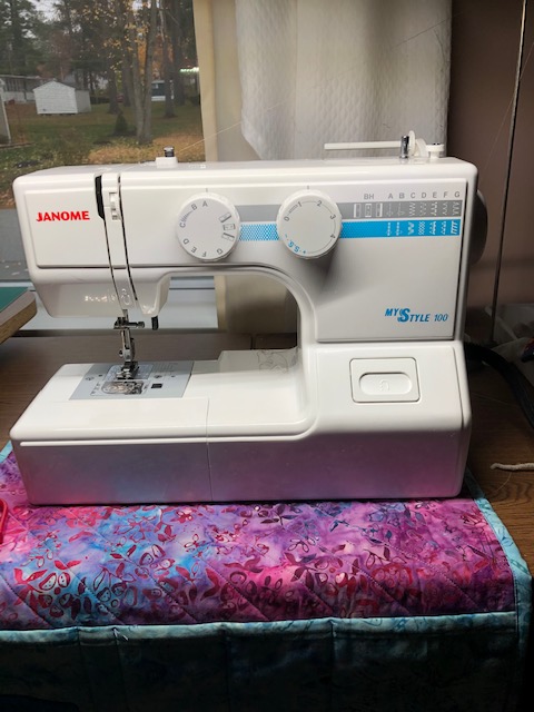 In the meantime, I have pulled out my little My Style 100. It is an awesome little work horse of a machine. I have pieced and quilted a table runner/wall hanging on it. It’s another one that was started and finished. All the scraps were cut into 1 1/2″ squares. Even the cut off backing was cut up. I’ll have that little four patch quilt finished in no time