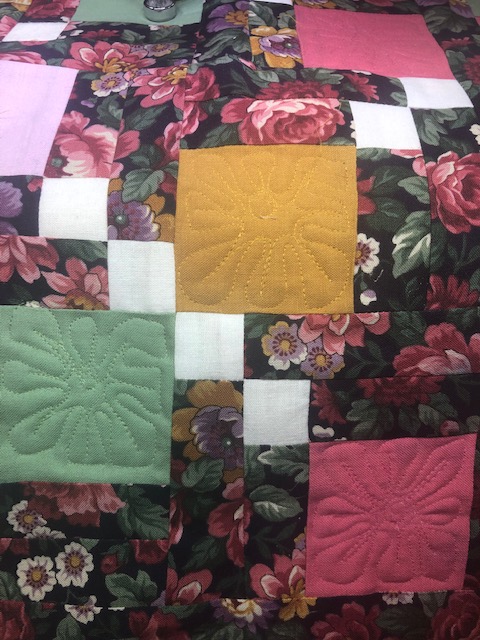 The flowers were free motion quilted with Superior Bottom Line thread. I have a bobbin holder full of this thread in lots of colors. Originally, I bought it to sew down applique.