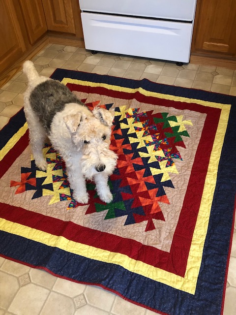One of my wall hangings has been on the wall at the peak of the living room in my Maine house for 20 years. I thought that it would be destroyed with the wood smoke, summer heat, and winter cold. It was taken down and washed. Amazingly, it is still as good as it was when I put it up there. Tessellating Triangles is one of my favorite patterns. It looks hard to make, but it is all straight sewing. Squares are pieced in rows and columns. They are recut with a square template on a diagonal and resewed. The cut off pieces can be resewn into a miniature version of the original quilt. I did make a queen size quilt with this pattern.
