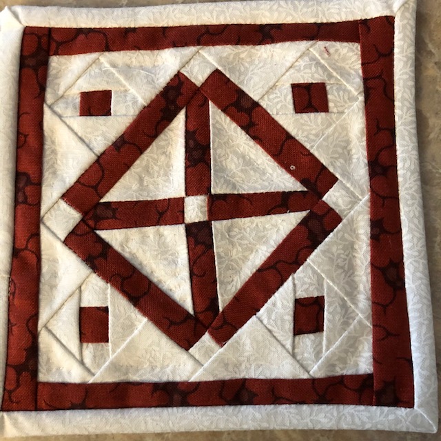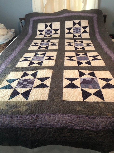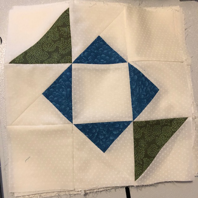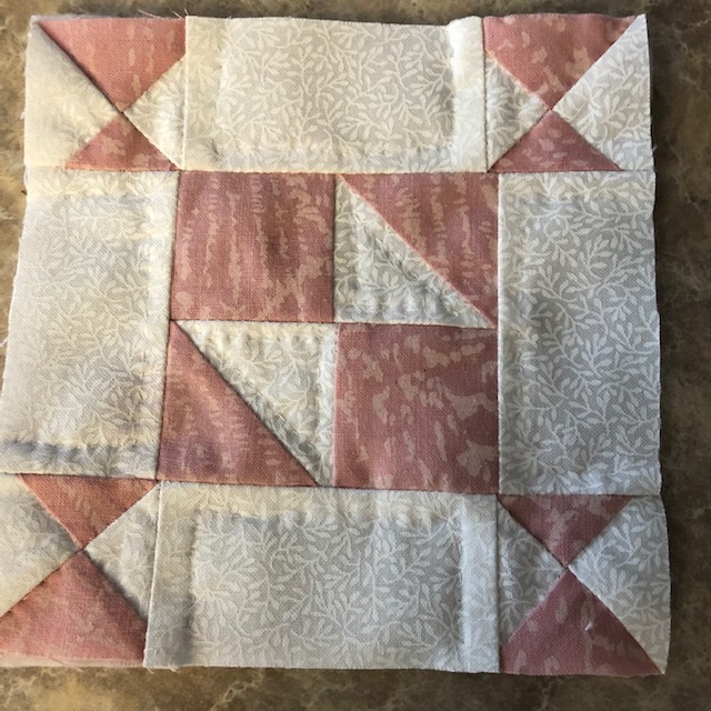 This is an old quilt. It was almost an antique before it was quilted. I hand pieced in the first five years of my quilting journey and this one is hand pieced. I like the idea of a quilt block in the middle of another quilt block. I may make another on like this. I’m looking for fabric for the binding. If I had made binding when I made it, it’s long gone. I’ll look for something today so that I can finish this quilt.