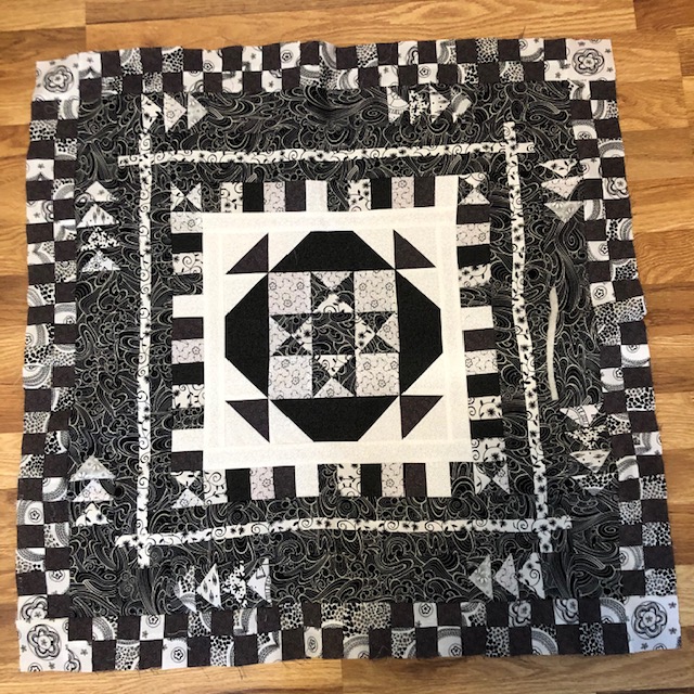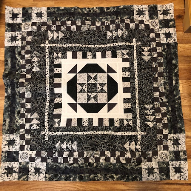 The black and white quilt is still is my favorite of the two. It is fun to just use value in choosing the fabric pieces. The fabric that I choose was too short to go the length of the row if I just had a star in each corner. I didn’t want to piece the length of the row. The corner of the previous row was 2″ not the 3″ measurement of the stars. It was time for a design element. The row would be 3″ wide so a 3″ star block would be fine in the corner. On each side of the star would be a 2″ x 3″ striped block. Then another star block. With all four corners made this way, I had enough length to piece the center of the border. That piece was strip pieced in the same configuration as the 2″ portion.