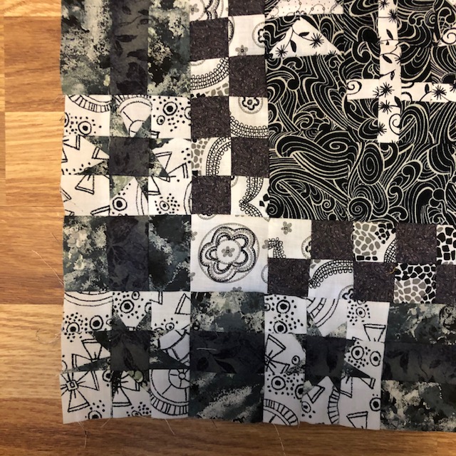 If we did not like wonky, we could make any star pattern. The checkerboard row was busy, so I thought that the wonky star row should be coping strips with just a few stars in the corners.
