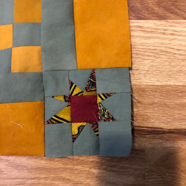 The colored SAHRR has just four stars, one in each of the corners. The wonky star is a nine patch. I wanted a narrow row so cut the patches 1 1/2″ square. That made a 3″ finished star. Running the pieces through assembly line method for the points was quick. I had Ginny Beyer fabric scraps leftover from the flying geese and the medallion center so used it for the points.