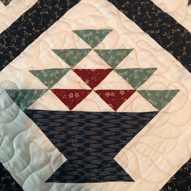 I have received a quilt back from my wonderful long arm quilter. She makes the quilts come alive. This quilt was made from the 10″ block patterns in Kimberly Einmo’s book, Precut Bonanza. The fabric was from the Robert Kaufman Japanese fabric box.