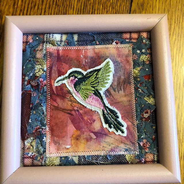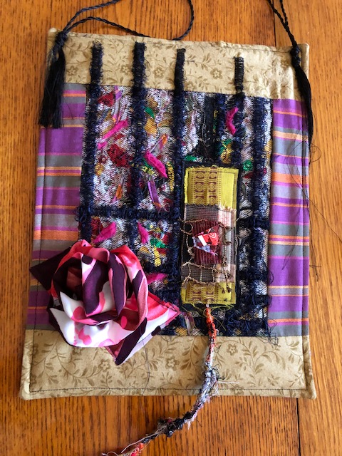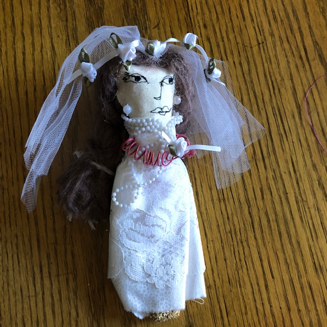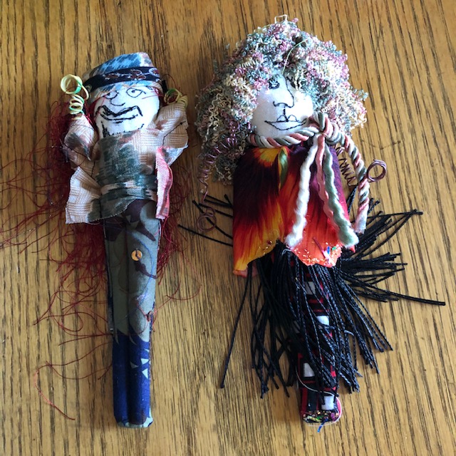 We made small dolls. The faces were free motion embroidered. The arms were make of wire that was wrapped around a pencil. Then we added scraps of cloth, beads, yarn and other things to give them life. We never knew if they were male or female until we started dressing them.