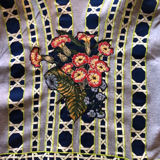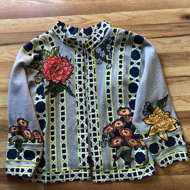 A gray sweatshirt was cut apart and embellished.
