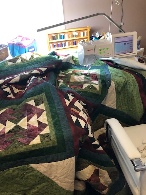 One of my king size quilts has been under the needle for machine quilting. I’m thankful for the Kangaroo Joey table that holds it up, so the quilting is easy. I quilt a little on this quilt several days in the week. It will eventually be done.
