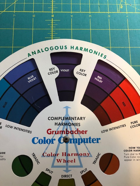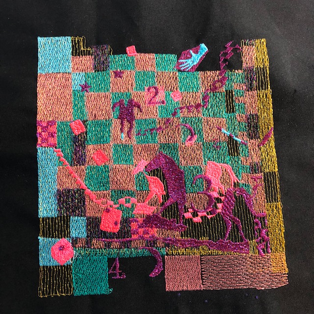This piece has many things to look at. There are two horses, a man that appears to have no head. a hand, chain, numbers and lots of other unusual things. Looking at it, I realized that it was made from analogous colors, plus one, the gold, from directly across on the color wheel.