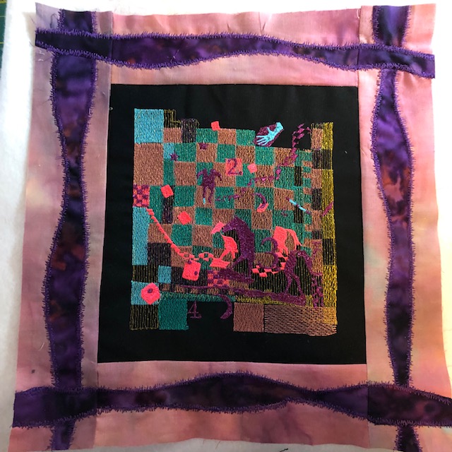 I have done what I said that I would not do. I have so many ufos to finish, I said that I would not start a new block of the month or another long-term project. I follow a blog that is written by the most awesome talented woman. She knits, paints wonderful artwork and quilts. She belongs to a group of women who are making a Stay At Home Round Robin. Her SAHRR center was unusual. I thought about two embroideries that I had in a bin of quilt parts. A friend had made the embroideries and gave them to me. I gave in and decided to join in making a SAHRR using one for the center of an “art” quilt.