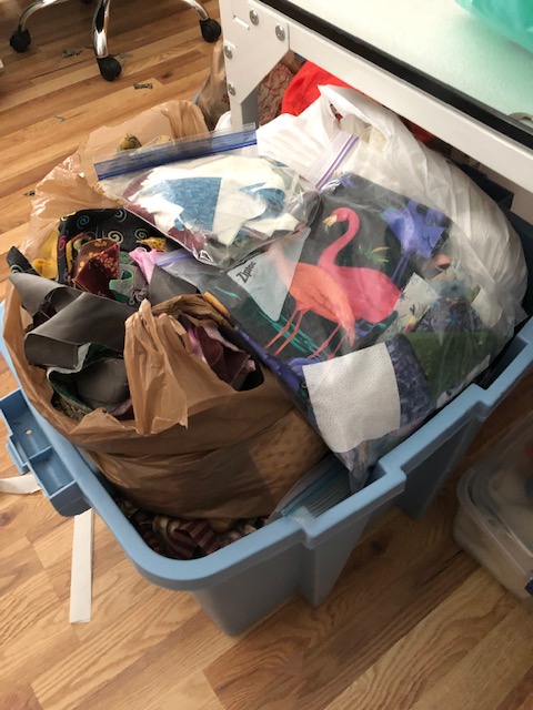 There is a bin in the sewing room with leftover pieces, partially pieced quilts and a lot of other stuff. most of it is in baggies, just waiting their turn to be finished.