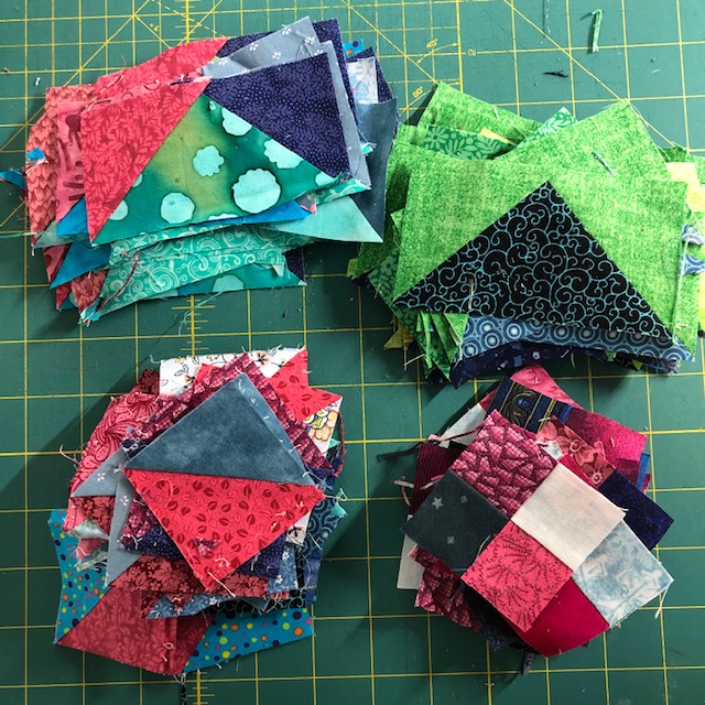 There are 60 flying geese. I don’t know why there are so many left over. There are also some four patches, half square triangle and some small pieces of fabric.