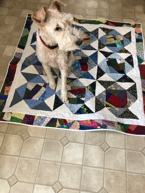 The next one was in the orphan block project and one that I used to practice new machine quilting patterns. It is a Mile a Minute quilt. I put it on the floor to take a picture and Miss Molly insisted on inspecting it. I’m not sure if she likes it.
