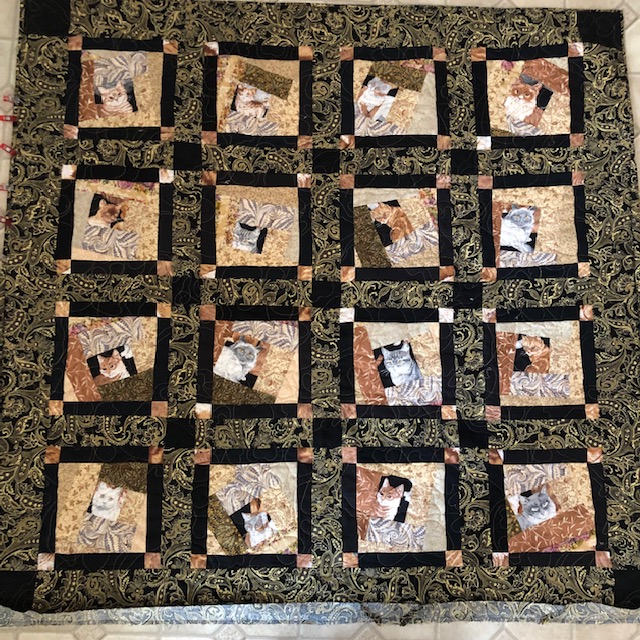 One of the quilts that came back from the longarm quilter is the most elegant mile a minute quilt that I have ever made. I fussy cut cats for the center of the blocks.