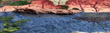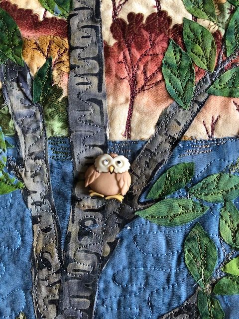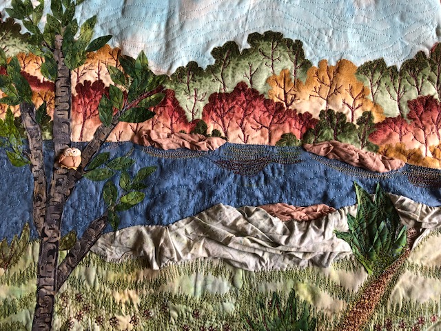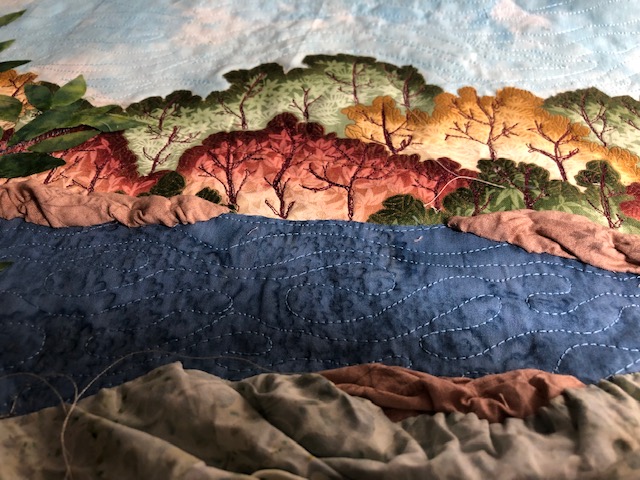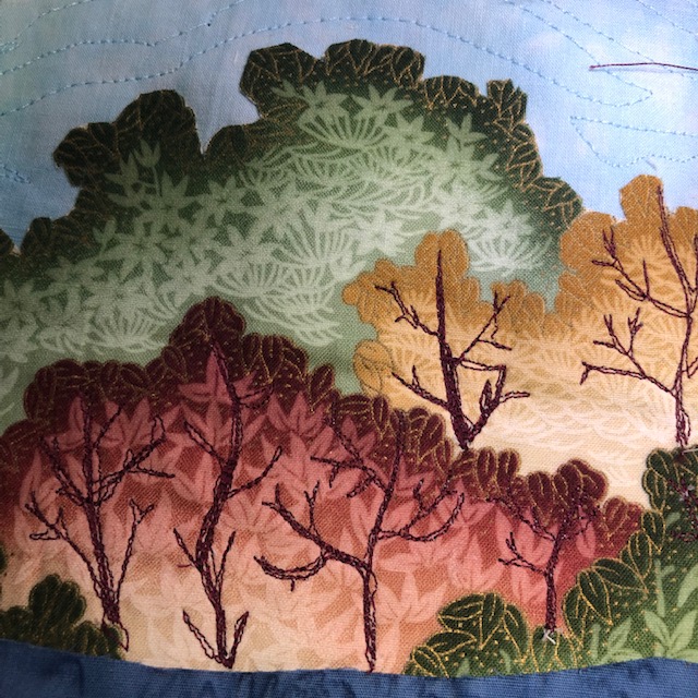 The sky and water were stitched in wavy swirls. A large tree was added on the side. It was fussy cut from a tree fabric. The leaves were cut from different green fused fabric. Later, the veins were stitched to hold the leaves in case the fusing failed. With the edges loose, the tree was more realistic.