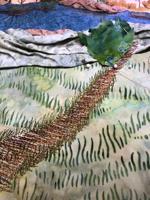 The green scrunched fabric was placed on the near shore. All the scrunched fabric was hand sewn down. Pieces were cut off and the fabric was rearranged as it was sewn down.