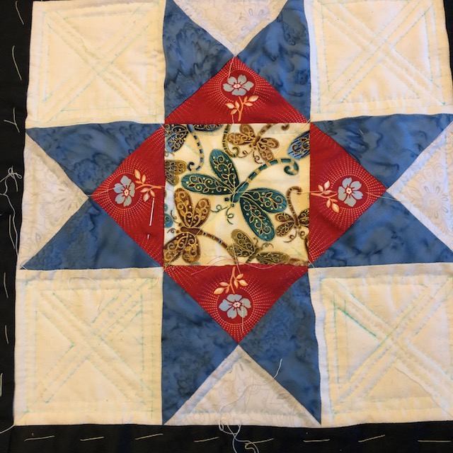 The third has fussy cut triangles. I have cut enough triangles to finish this quilt. The rest should be easy. I’ve been hand quilting this block in the evenings. The dragonfly section is finished as are all the white corners and outside triangles. I should finish quilting this block tonight. Then I have eight more blocks to piece and quilt. I’m not hand piecing. I am using the machine. It’s much faster. The other blocks will be hand quilted because I hand quilted the first block.
