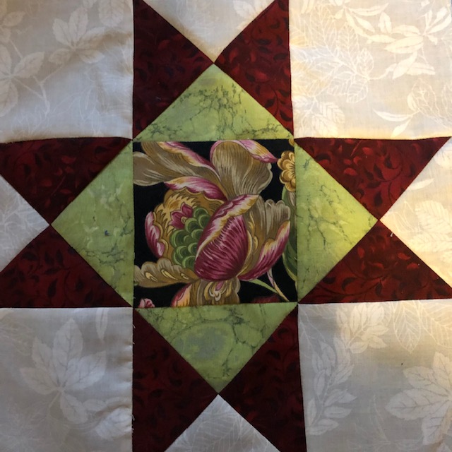 The second one is a pretty green, with red star points. I fussy cut the center, The ladies also fussy cut their centers. I have a baby that will be born next year in mind for this quilt.