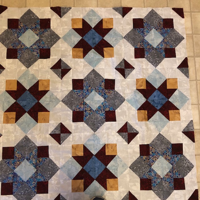In the meantime, I saw a pattern for a quilt that I just had to make. The original pattern was for a full-size quilt. I wanted a baby quilt, so I made only nine blocks. The center is finished. The borders and binding are cut and ready to be sewn. It is a baby quilt, so it won’t take long to quilt. Hopefully, I’ll stick to my new plan of quilting every new quilt that I make. I don’t want it to go into the pile of ufos and never resurface. If you look closely, you will see that the center of the block in this quilt is the same star block as above blocks. It has sashing that is flying geese, squares and half square triangles. It is made differently. There are just squares and half square triangles.