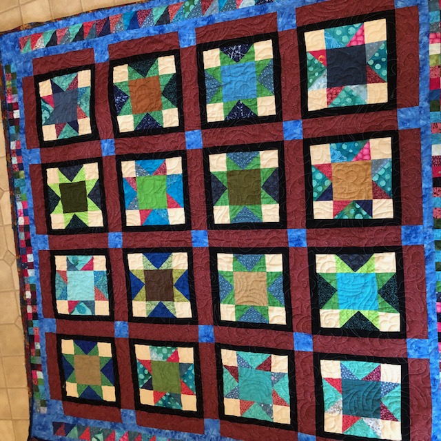This one was made with scraps left over from a mystery quilt challenge. A friend also did the challenge and gifted me with her left-over pieces. There were enough to make this quilt. It will be a Christmas present. The binding is almost finished.