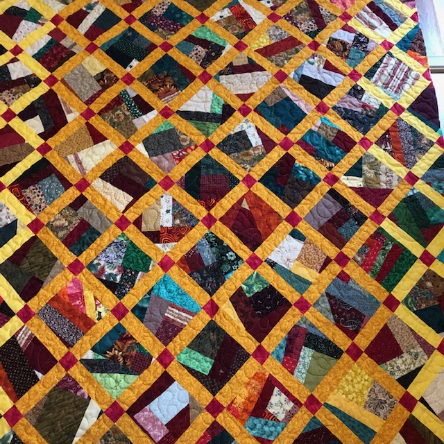 This is a mile a minute quilt with a poor color choice for the sashing. The picture actually tones it down. Orange was not a good choice. I haven’t decided what to do with it yet. I can take my time with the binding and work on other things in the meantime. Someday it will find a home.