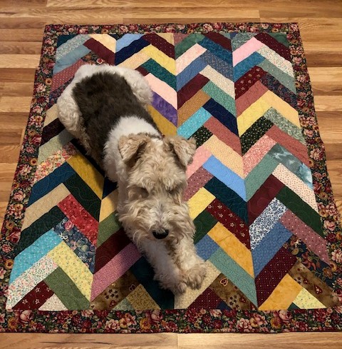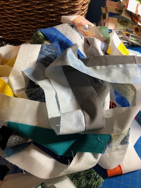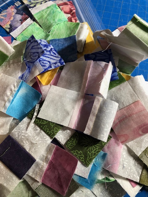 There was a small box in the corner of the sewing room. When I finished a quilt, I cut the scraps into 1/2″ strips or small square pieces. They went into the box. One day this month, I decided to work on these tiny pieces. They were jammed in and pressed down. My sewing machine has been working hard to put these pieces together.