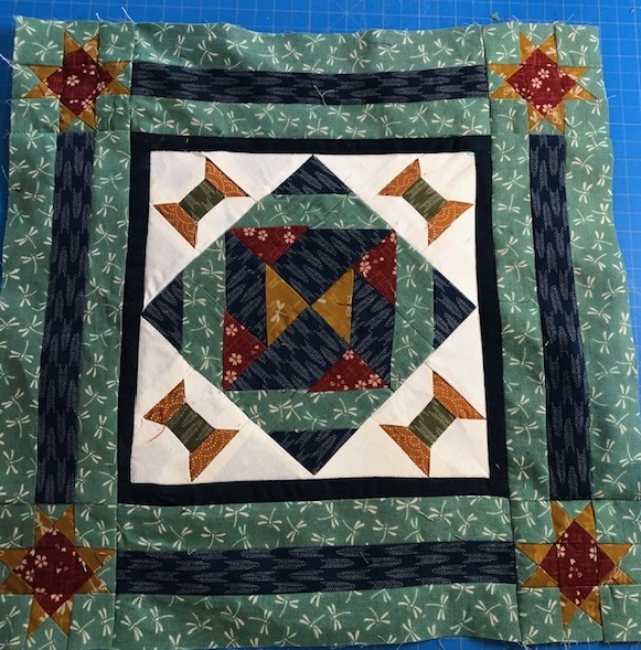 The stay at home round robin 23 is in the third week. The Robert Kaufmann Japanese fabric is perfect for it. I chose one of the small blocks for the center. The first row is the spool block. I set the small block on point and placed the spools in the corners.