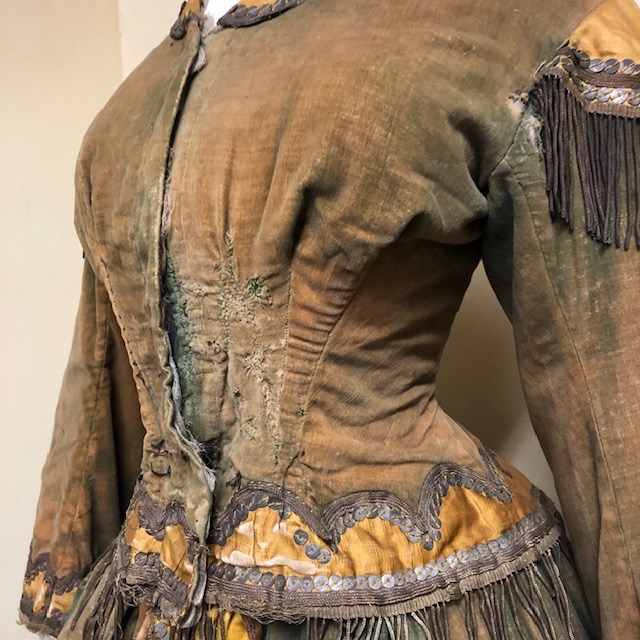 The John P. Hale house has objects from another time period. The furniture is beautiful. There is so much to see in this building. We kept saying “Look at this.” One of the displays that was interesting is a woman’s dress. It had a lot of yardage. The dress was in two pieces. The skirt was held together with hooks and eyes. They were hidden under a fold in the cloth. Hand embroidery embellished the dress. We imagined washing and ironing this dress.