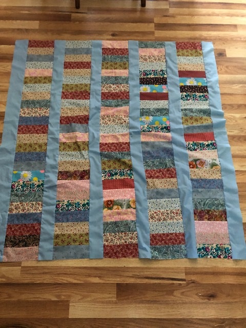 I was able to make two community quilts from the $1.00 strips and the gifted fat quarters. Miss Molly really liked this one.