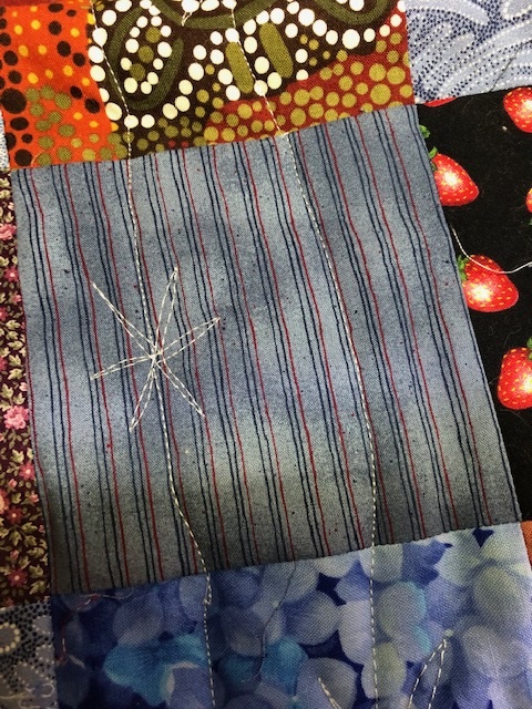 I had a community quilt on the sewing table. It had been there for a while, and it bothered me. Frankly, I was overwhelmed with thinking about it. It was ready to quilt. Angela Walters was another quilter that I watched. She said that that the reason there were so many quilt tops unquilted was because people didn’t start. That was obvious. Then she showed an easy quilting pattern that worked up fast. I went into the sewing room and quilted one row with this pattern. Then, I walked out and shut the door. The next day, I quilted one more row. The quilting consists of a star and a curvy line. Every star is a little bit different.
