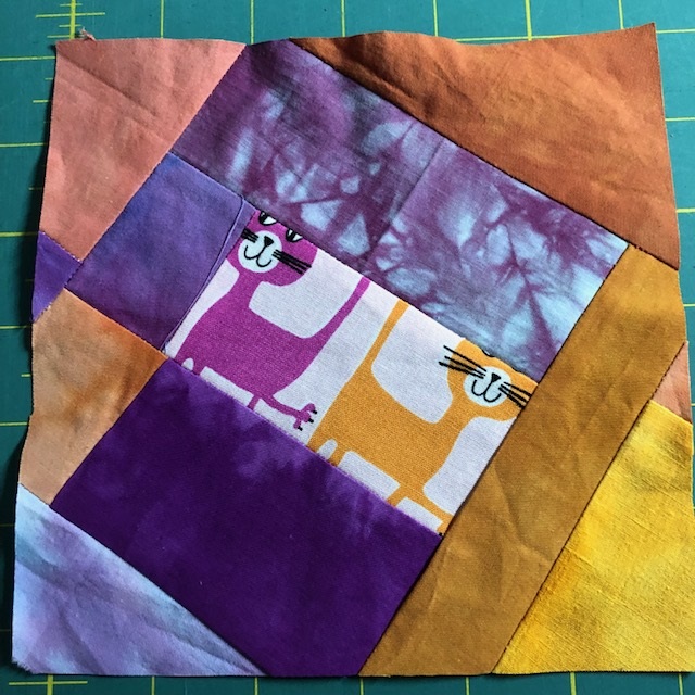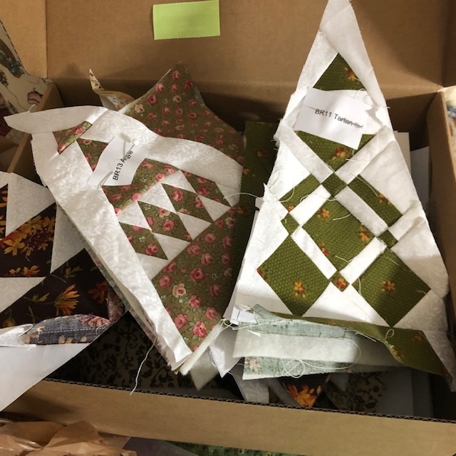 There are 52 pieced triangles and 48 plain triangles in the border, along with the four corners. Most of the pieced triangles have to be paper pieced. Some are appliqued and some have curved piecing. They will all be finished in the potholder method before placing them around the center quilt. When I piece a block, I make a backing out of the colored fabric and if there is enough fabric left, I piece two plain triangles. Triangles of batting are also cut at this time. All the units are in a box waiting to be hand quilted and bound.