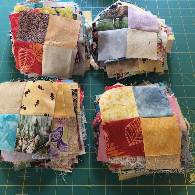 When I pressed the four patches, I swirled the seams so that they would nest when I made eight patches. The plan is to continue in this manner until the piece is large enough for a community quilt. Two eight patches will make a sixteen patch and so on. I’m not sure how many quilts this pile of four patches will make. I’ll just keep sewing until they are all gone.