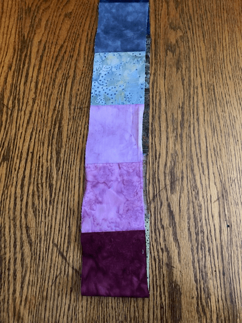 When the cut strips were sewn back together, they moved up one block. Therefore, it was easy to finger press rather than pin each seam. The seams went in opposite directions.