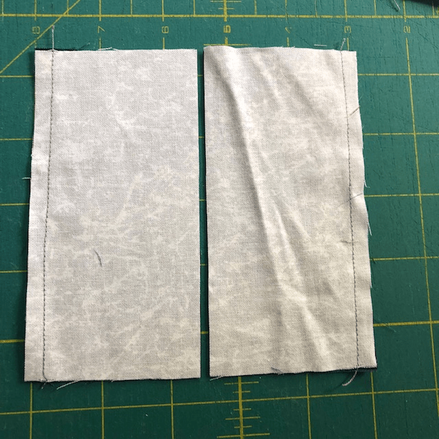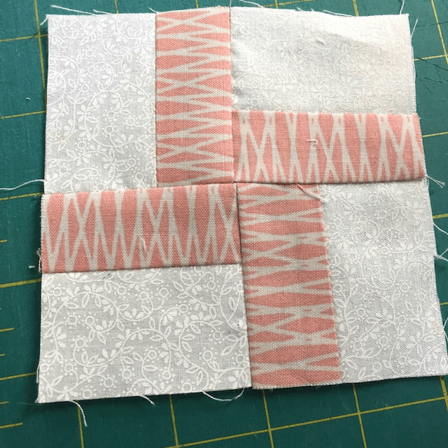 In the meantime, I have been wanting to try a new method of making four patches that was found on the Internet. Line up two fabrics right sides together. Sew on two sides. Cut in half.