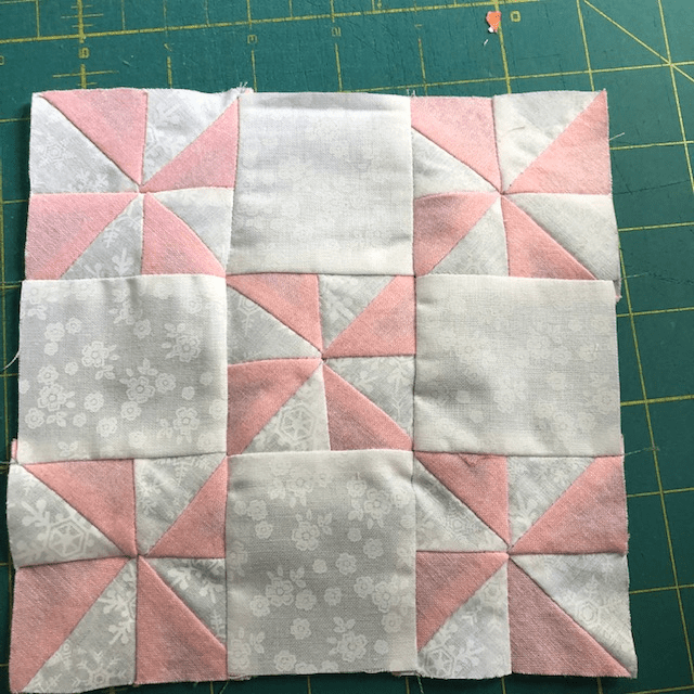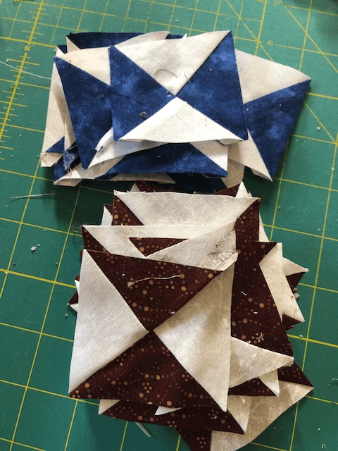 At some time in the past, I had started to make half square triangles from three charm packs that were alike. I finished making the half square triangles and trimmed them to 4 1/2″. I have found a pattern for an oversized block. Four blocks and a border will make a good size quilt. These pieces are in a craft bin.