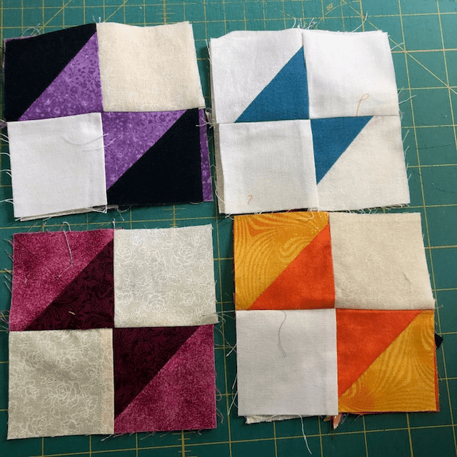 Then, I wanted to try another new method of making quarter square triangles. Line up two four patches, reversing colors, and sew all the way around the block. Cut on the diagonal, both ways. Trim.