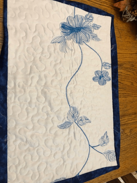 So far, I have 20 placemats for Meals On Wheels. They are made with leftover blocks and cut square of all sizes. The top one was a handout in a class. We ever did use it. It was already quilted and the perfect size for a placemat. It just needed a binding.
