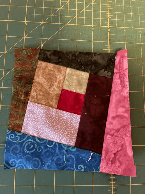 The small pieces were moved around until I thought they were where they were supposed to be. I made log cabin strips and sewed them around the blocks. There were ten blocks and as hard as I tried, I could only find the space for nine. The tenth block will be the label on the back.
