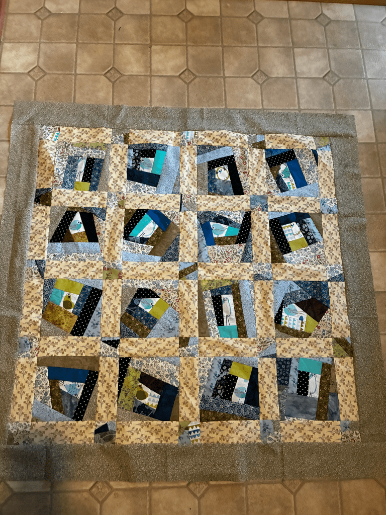 I’m making new samples. The first one is a baby quilt. I wanted to show a Mile A Minute with a planned center. I had a sample with funky birds and used it in the first row.