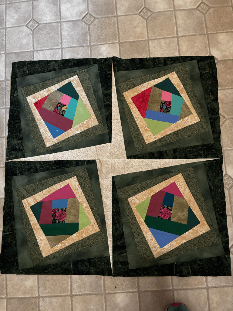 One of the quilts that I gave away was one of my favorite quilts. I’m making another one like it. The center has four Mile A Minute blocks. It is set on a diagonal. Some of the borders are also Mile A Minute. The colors that look gray are actually green. This will be a tablecloth for my dining room. It may be a little different from the original. I’ll add borders until it fits the table.